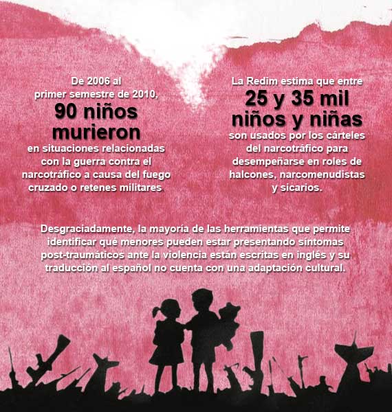 A Luis David, un estudiante de sexto de Primaria de una escuela privada, le han enseñado cómo actuar cuando hay balaceras a base de pitidos de silbato: “El primer silbatazo es para que nos aventemos al suelo, el segundo es para que nos tapemos la cabeza y el último es para que nos levantemos”. La psicóloga Genoveva Guzmán quien ha atendido pacientes que han sufrido secuestros por parte de grupos del narcotráfico entre otros casos de violencia relacionados con éstos, explica: La violencia que se vive en ciudades afectadas por el crimen organizado tiene un impacto muy fuerte en los niños. Se dan dos casos. El primero, es que les provoca fuertes sentimientos de angustia e inseguridad.